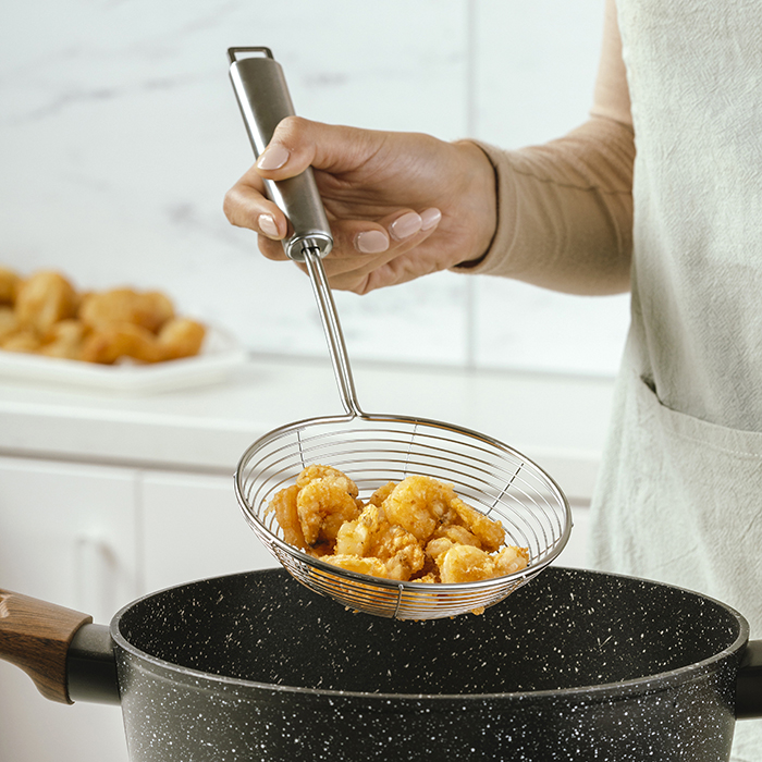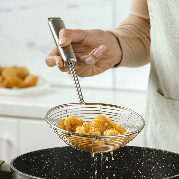 Made entirely of high-quality stainless steel, with a thin, densely woven mesh, it is ideal for any task that requires a fine drain. With a long, durable handle it offers a comfortable, stable grip and safe use. Features a practical hole in the edge which allows you to hang it.